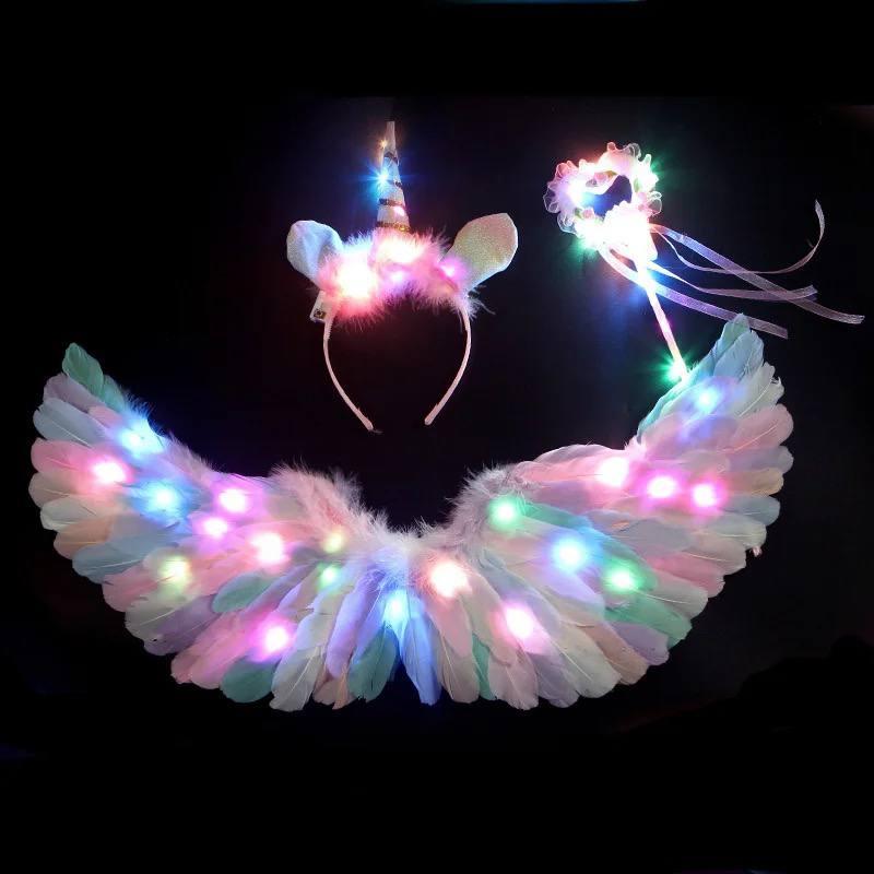 - Крила з пір'я з підсвічуванням: Елегантні білі крила виготовлені з м'якого пір'я, яке надає їм легкості та ніжності. Вбудоване LED-підсвічування створює чарівний ефект, що робить крила помітними і привабливими навіть у темряві. Крила легко кріпляться на спині за допомогою зручних резинок.