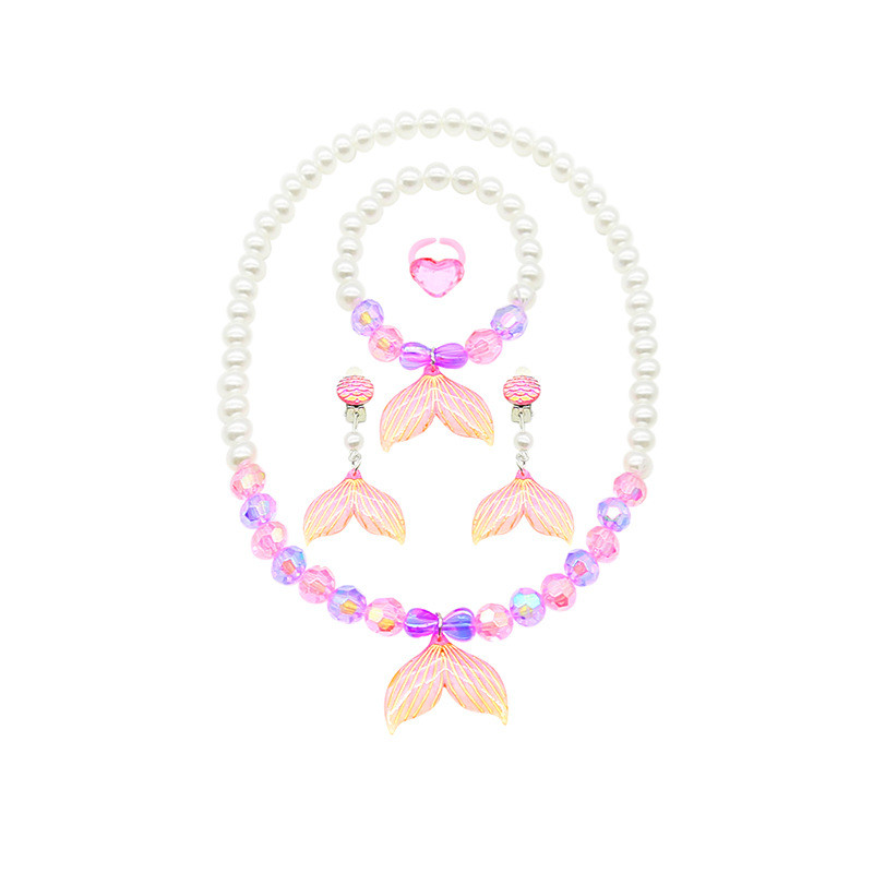 - Сережки: З перлинними акцентами та підвісками у формі хвоста русалки, вони підкреслюють чарівність юної модниці.